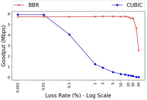 我们得知,内核需要根据实际场景进行优化,不能一概而论。合理优化,可以提升性能很多(有时能够提升10倍),但如果盲目优化,性能反而下降。 当今的内核,在大部分场景下,TCP buffer能够自动调整buffer大小来匹配传输,所以在内核方面需要优化的地方就是选择合适的拥塞控制算法。 下面是Linux默认算法CUBIC和BBR算法在丢包情况下的对比情况:
