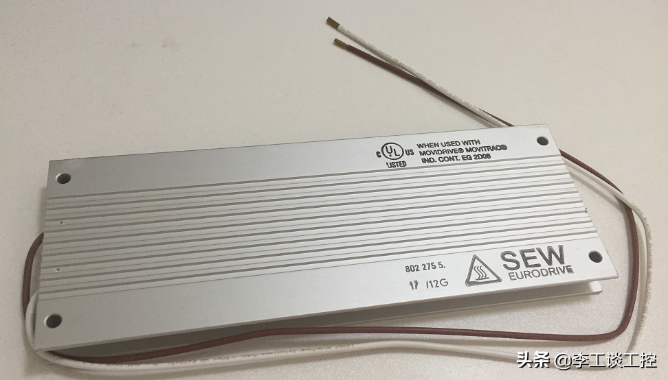 要讲清楚制动电阻是怎么工作的,还得先从电动机的工作原理说起。 我们知道,三相异步电动机的转速公式为:n=60f/p(1-s)。其中“n”代表电机的转速;“f”表示交流电源的频率;“p”表示电机的极对数;“s”表示转差率(同步磁场的转速n0与异步电机的转速n的差值与同步磁场的转速n0之比)。对于一个成品电机而言,极对数p是不变的,因此我们只能通过改变交流电源的频率来改变异步电机的转速,这也是交流变频器的调速理论依据。 三相异步电动机有两种运行状态——电动运行状态和发电运行状态。 1.电动运行状态: 当三相异步电动机接通电源后,会产生一个旋转磁场(该磁场与三相交流电的磁场同步,因此又称为同步磁场)。旋转磁场切割转子绕组而产生感应电动势,从而在转子绕组中产生电流。产生电流的转子绕组在旋转磁场中受到电磁力的作用而产生电磁转矩,于是三相异步电动机就转起来了。这种情况下,异步电动机的转速n总是小于旋转磁场的转速n0,此时是磁场带动电动机运行,电动机处于电动状态。电动状态下,电磁转矩的方向与电动机的运行方向相同。 2.发电运行状态: 在电动状态下,通过外力使电动机的转速n继续增大。某一时刻当n大于旋转磁场的转速n0时,转子绕组产生的电动势的方向将会反向,转子中的电流反向流动,于是产生了与电动机运行方向相反的电磁转矩。这种情况下,电磁转矩起到制动的作用,异步电动机处于发电运行状态。发电状态的典型场景是起重机快速下放重物、电动汽车急速下坡及快速停车等。 在交流变频调速中,变频器通过改变输出电源的频率来达到改变电机转速的目的(变频的同时要改变电压)。通过增大频率使电机加速,通过减小频率使电机减速。 在一个负载惯性较大的拖动系统中,变频器通过减小频率让电机减速并停机。在频率减小的瞬间,电机同步磁场的转速也随之下降。但是由于机械惯性,转子的转速并不会瞬间降低。此时,电机转速n大于同步旋转磁场的转速,电动机处于发电运行状态。电磁转矩成为制动转矩促使电机转速下降,再生电能经过整流后回到直流母线中。在没有能量回馈单元的变频器中,再生电能无法回馈到电网中,只能通过变频器本身的电容来吸收。这会造成电容短时间内电压快速升高,称为“泵生电压”。泵生电压导致直流电压急剧上升,有可能会击穿元器件导致变频器损坏。 为了解决泵生电压的问题,在没有能量回馈单元的变频器中使用制动电阻来消耗再生电能。当直流母线的电压升到阈值时,制动单元将会打开制动电阻的通道,再生电能以热能的形式消耗在制动电阻中。制动电阻有不同的功率,要根据实际情况进行选择。很多变频器在其内部连接了一个小的制动电阻,但是如果再生电能较多,还需要外部连接制动电阻。 下面这张图是SEW变频器的制动电阻的外观: