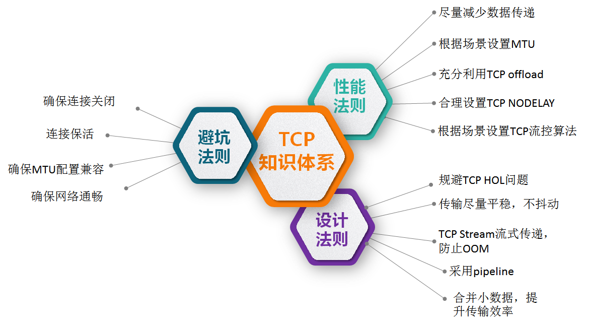 tcp/ip系列知识分享完毕,之后会分享一些工作中的典型网络案例和troubleshooting过程。 后续还会出一个postgresql从小工到大牛的系列专辑文章。 废话不说,直接干货。 TCP知识体系我们从三个维度去分析服务器开发的TCP知识体系,分别为性能法则、设计法则和避坑法则。