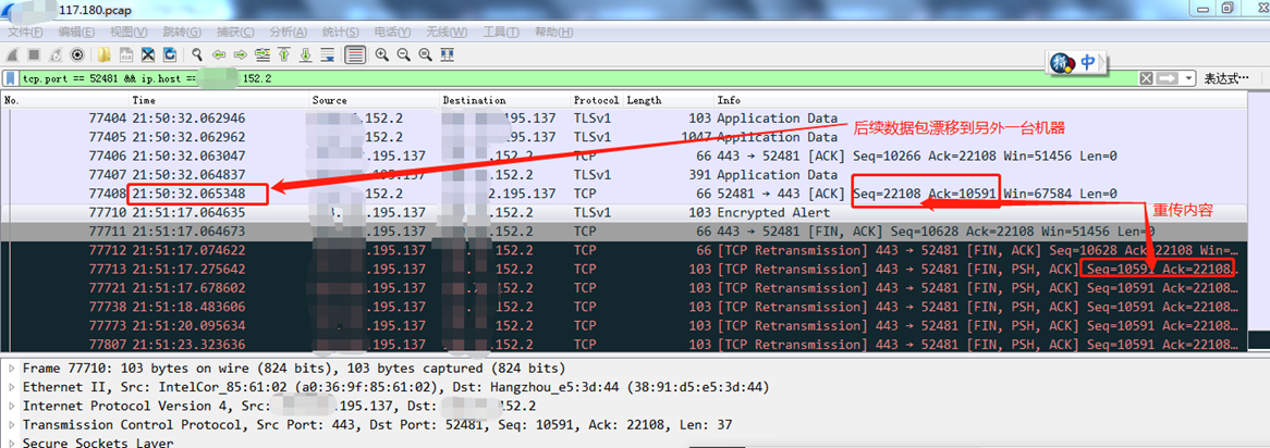 目前,很多协议或者软件采用pipeline机制来提升应用的吞吐量,例如HTTP v2协议支持pipeline发送请求,Redis采用pipeline机制来提升应用的吞吐量。 运行TCPCopy的时候,intercept返回响应包的TCP/IP header给tcpcopy。一般TCP/IP header只有几十字节,如果每次write操作只传输一个响应包的TCP/IP header,那么效率就会非常低。为了提升传输效率,intercept合并若干个响应包的TCP/IP header信息一起发送。 4、避坑法则4.1 加上keepalive机制TCP keepalive机制可以用来检测连接是否还存活,具体可以参考"对付Reset流氓干扰:TCP keepalive"。 云环境、中途设备程序、TCP offload和负载均衡器或多或少存在一些问题,而这些问题如果不及时解决,会极大影响程序的性能和问题排查。 这方面一般可以通过抓包的方式去查明问题。 下面展示了负载均衡器自身bug导致了网络不通畅。 由于负载均衡器没有严格按照TCP session的方式进行负载均衡,有些TCP session的数据包跑到了不同的机器,进而导致应用端报请求超时。 最初连接<client IP:xxx.xxx.152.2,client port:52481,server IP:yyy.yyy.195.137,server port:443>的数据包跑到了180机器。