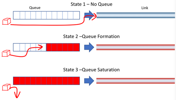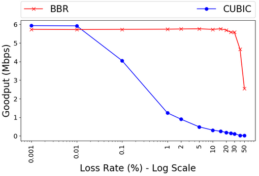 第一种是最理想的情况,数据包到达路由器,无需等待就能直接转发出去;第二种是等待一段时间,才能发送出去;第三种是因为路由器queue满,数据包被路由器丢掉。 发送数据过猛可能导致第三种情况发生。 下面展示了Linux默认算法CUBIC和BBR算法在丢包情况下的吞吐量对比: