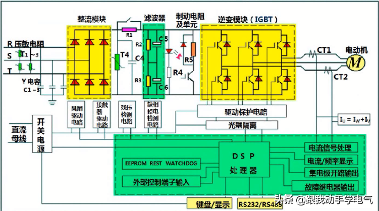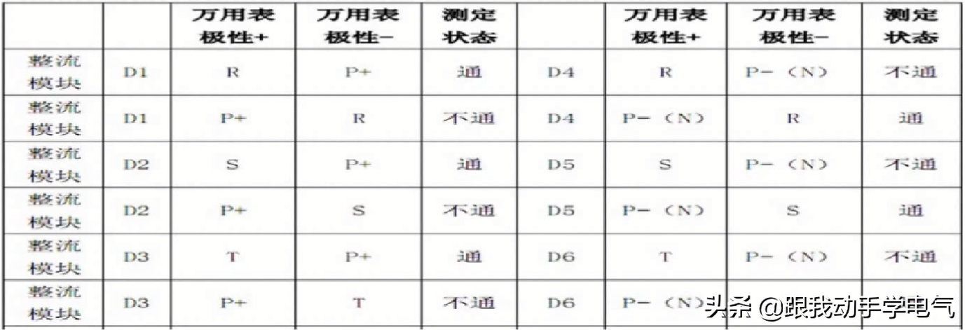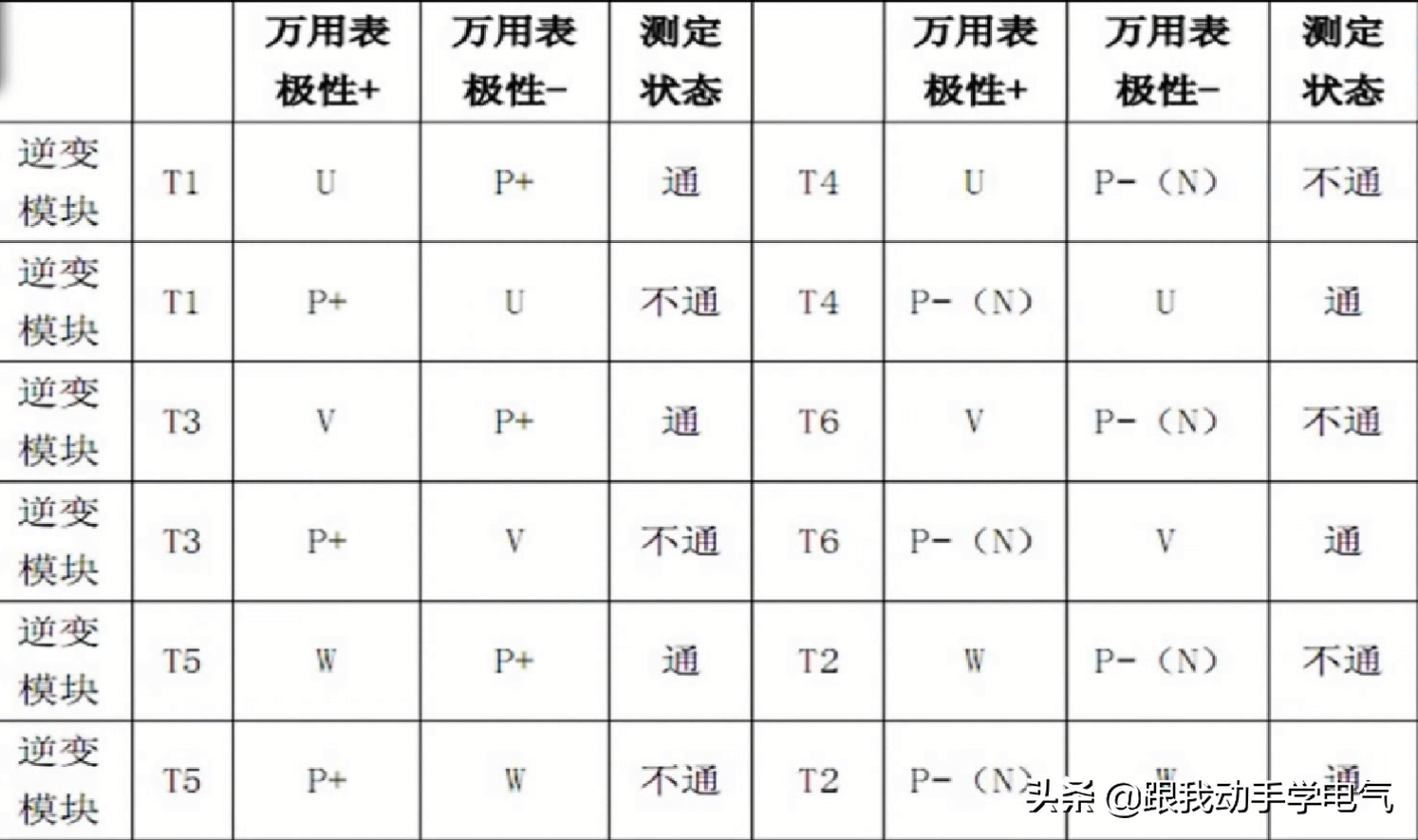 (7)逆变单元:一般都是IGBT,是变频器的核心部件,其实IGBT相当于是一个开关,开关频率很高2KHz~20KHZ(载波频率),耐高压(1200V),电压型驱动,驱动电压15~20VDC,驱动电流10mA~16mA。 IGBT模块具有很强的温度敏感性,随着外壳温度的上升,通过IGBT模块的有效电流明显下降。所以要保证变频器的散热。 (8)CT:电流互感器,用于检测输出电流保护IGBT、变频器控制、保护电机等功能。 功率模块检测方法:同万用表二极管档。按如下表来检测: