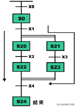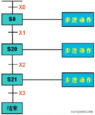 比如说当前处于初始状态S0,当转移条件X0成立的时候,就会从S0状态转移到S20状态去,这时就可以执行这个状态的输出动作,执行右行。