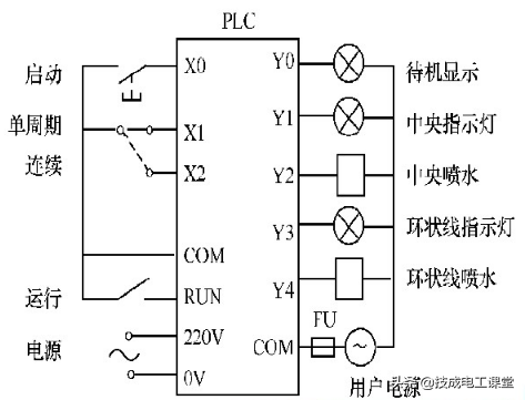 我们举个绘制顺序功能图的例子——花样喷水控制。 动作过程如下: 启动中央→指示灯亮1S→中央喷水1S→环状线指示灯亮1S→环状线喷水1S