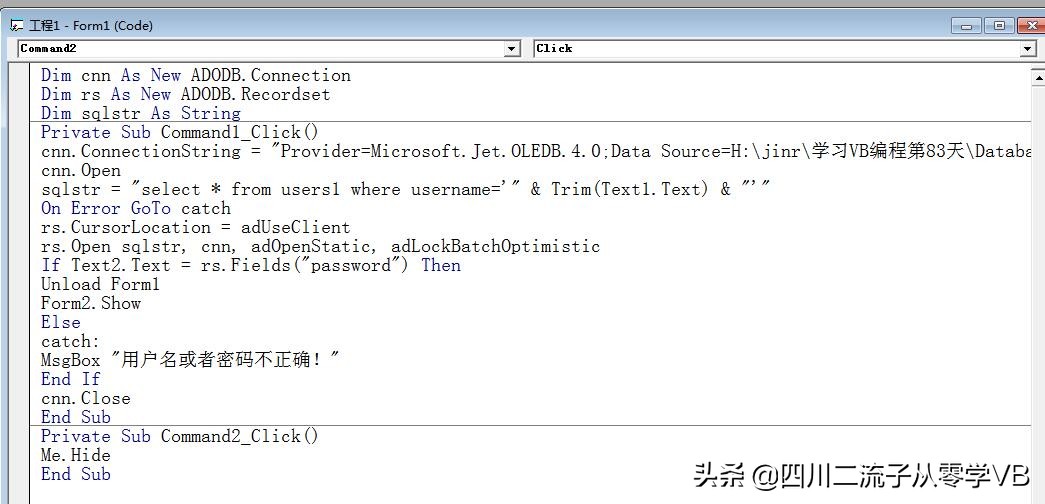 如图新建一个窗体,并在窗体上新建两个label控件,两个text控件,两个command控件。新建一个2003版本的access数据库,设计一张名为user1的表格,表格中包括username和password字段。将数据库文件Database1.mdb放置在VB工程所在的目录。