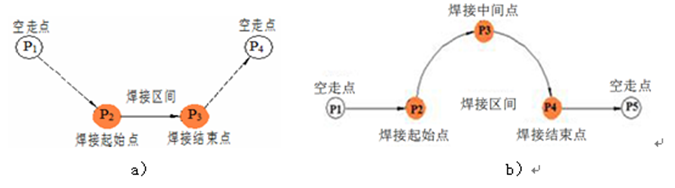 对于有规律的轨迹,仅示教几个特征点,计算机就能利用插补算法获得中间点的坐标,如直线需要示教两点,圆弧需要示教三点,如图下图所示。  示教编程