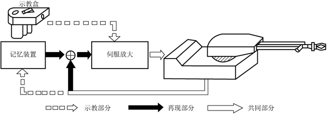 第一种编程方法示教编程法 应用情况:应用最早(早期的机器人编程几乎都是采用示教编程方法)最普遍(目前工业机器人使用最普遍的方法)在生产现场进行 。其工作过程分为“示教”和“再现”两个阶段。在示教阶段,由操作者操纵示教器上的操作手柄来操作机器人,使它按需要的姿势、顺序和路线进行工作。在该阶段机器人一边工作一边将示教的各种信息存储在记忆装置中。在再现阶段,机器人从记忆装置中一次调用所存储的信息,利用这些信息去控制机器人再现示教阶段的动作。  示教再现原理过程
