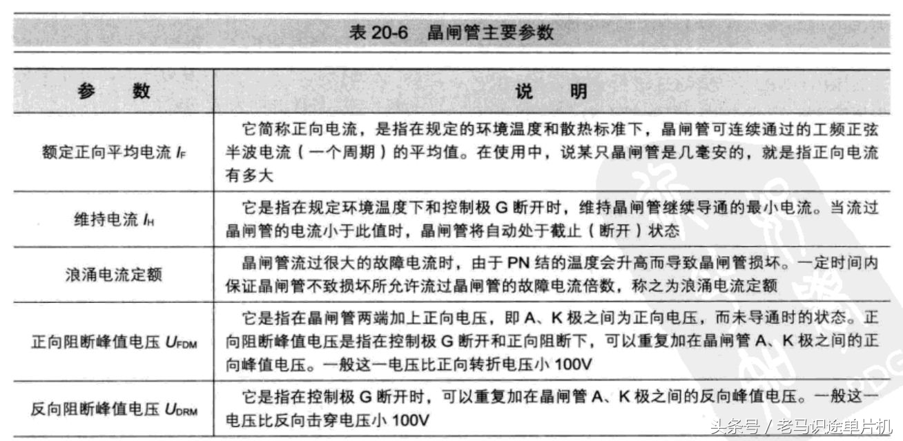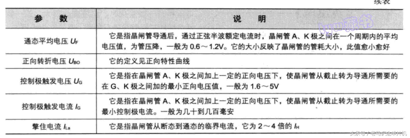 晶闸管结构及工作原理从下图可以看出,晶闸管是一个有3个PN结的4层半导体器件。由最外面一层P型材料引出一个电极作为阳极A,由最外面一层的N型材料引出一个电极作为阴极K,中间的P型材料引出一个电极作为控制极G。 下图所示是4层半导体结构等效成两只三极管电路示意图,给A\K极之间加上正向电压,然后再给G\K极之间加上正向电压时,VT2正向偏置而导通。其集电极电压下降,VT1也导通。 晶闸管伏安特性晶闸管主要参数晶闸管应用电路下图是晶闸管在报警控制电路中的应用 晶闸管在电路中起可控开关的作用。