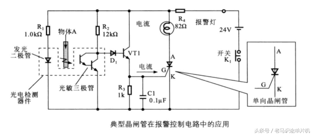 只要有触发信号加到晶闸管的触发端,晶闸管就会导通,触发信号消失,晶闸管仍导通。当物体被移到光电检测器中时,发光二极管被遮挡,光敏晶体管无光照而截止,D1正端电压上升,正向偏置,电源经R2,D1为晶体三极管VT1提供基极电流,使VT1导通。导通瞬间为晶闸管的触发端提供触发电压,于是晶闸管导通,报警灯的电流增加而发光。这种情况下,即使物体离开检测区。晶闸管仍处于导通状态,报警灯关断,只有关断一下K1,才能使电路恢复初始等待状态。