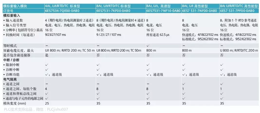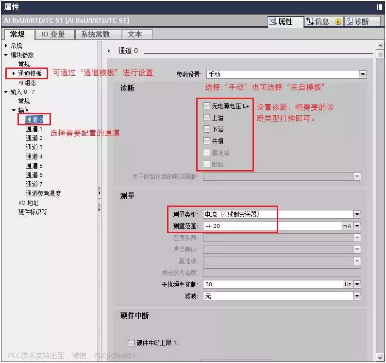 S7-1500系列,模拟量输入(AI)模块参数配置 1、添加模块 添加模块与数字模块操作方式一样,直接拖拽或者选择好卡槽后双击模块。 ||点击图片可放大|| 2、模块种类 一个模拟量输入模块最多可以输入8路模拟量信号,每一路可以连接不同的传感器。为了匹配不同传感器的接线方式,需要在模块上配置相应的参数,参数与传感器不匹配,采集到的信号会不准确。 本文以AI8xU/I/RTD/TC ST(6ES7531-7KF00-0AB0)为例讲解模块参数设置。6ES7 531-7KF00-0AB0是最常用的模拟量输入模块,可以输入电流,电压,热电阻,热电偶,电阻信号,但是用作电阻/热电阻测量时只有4通道,不建议使用该模块测量电阻信号。 3、常规信息 常规选项主要用于标注模块的基本信息,各种模块以及CPU中的常规信息都是相同的,需要了解的可以点击下列文章复习。 4、通道参数 同数字量模块一样,可以通过组态“通道模板”进行设置通道参数,当然也可以手动单独组态各个通道。 这里以手动组态各个通道为例,讲解参数设置。 上图中需要设置的参数比较多,一般情况只需要设置好“测量类型”和“测量范围”模块就能正常使用了,关于诊断和硬件中断这里不做介绍了,用到相关配置时可以自己查阅相手册。 有时候一个8路的输入模块,我们值用到其中几路,对于未使用的通道,测量类型最好选择禁用设置,这样在通道的A-D转换时间被设置为0S。 S7-1500中可以直接设置每一个通道的测量类型和测量范围,而不必像S7-300/400那样每两个通道一组。