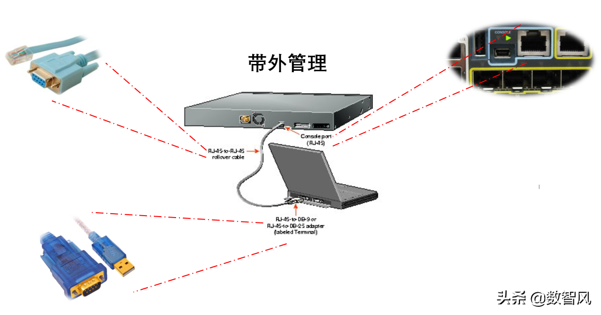 3、交换机的带外连接对交换机的管理可以通过带内管理,也可以通过带外管理。带外管理的连接方式一般通过交换机的Console线来连接,console线一般是RS232线缆。连接方式很简单,一头是连接电脑的RS232串口,一头是连接交换机的RS232接口。现在的笔记本一般都没有串口,我们需要配备一个usb-to-rs232转接器。交换机端也一般不配标准的串口,一般都是RJ45接口形状,厂家会配备专用线缆。连接样图如下: