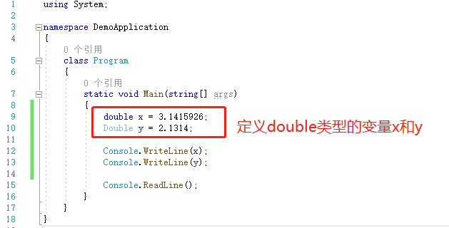 从输出中,我们看到了变量x的值为3,以及max和max32这2个变量的int型最大值是一样的。 2)double类型 双精度数据类型用于处理小数。在这种情况下,数字是整数,例如10.11、20.22或30.33。在C#中,数据类型由关键字“ Double ”表示。下面是此数据类型的示例。同样的double和大写开头的Double是一样的。 在我们的示例中,我们将定义一个名为x的双精度变量。然后,我们将给变量分配一个Double值,然后相应地显示它。