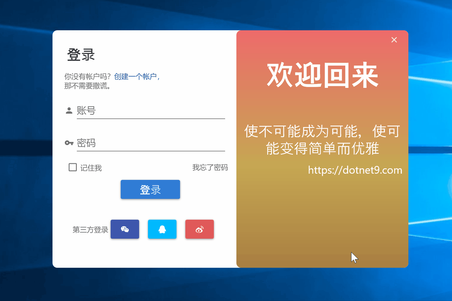 2.1 App.xaml文件引入样式文件【App.xaml】,在 StartupUri 中设置启动的视图【MainWindow.xaml】,并在【Application.Resources】节点增加 MaterialDesignThemes库的样式文件: <Application x:Class="Login.App" xmlns="http://schemas.microsoft.com/winfx/2006/xaml/presentation" xmlns:x="http://schemas.microsoft.com/winfx/2006/xaml" StartupUri="MainWindow.xaml"> <Application.Resources> <ResourceDictionary> <ResourceDictionary.MergedDictionaries> <ResourceDictionary Source="pack://application:,,,/MaterialDesignThemes.Wpf;component/Themes/MaterialDesignTheme.Light.xaml" /> <ResourceDictionary Source="pack://application:,,,/MaterialDesignThemes.Wpf;component/Themes/MaterialDesignTheme.Defaults.xaml" /> <ResourceDictionary Source="pack://application:,,,/MaterialDesignColors;component/Themes/Recommended/Primary/MaterialDesignColor.DeepPurple.xaml" /> <ResourceDictionary Source="pack://application:,,,/MaterialDesignColors;component/Themes/Recommended/Accent/MaterialDesignColor.Lime.xaml" /> </ResourceDictionary.MergedDictionaries> </ResourceDictionary> </Application.Resources></Application>2.2 MainWindow.xaml 登录窗体文件【MainWindow.xaml】,设计登录主界面,代码量很小,源码如下: <Window x:Class="Login.MainWindow" xmlns="http://schemas.microsoft.com/winfx/2006/xaml/presentation" xmlns:materialDesign="http://materialdesigninxaml.net/winfx/xaml/themes" xmlns:d="http://schemas.microsoft.com/expression/blend/2008" xmlns:x="http://schemas.microsoft.com/winfx/2006/xaml" xmlns:mc="http://schemas.openxmlformats.org/markup-compatibility/2006" mc:Ignorable="d" Title="Login" Height="400" Width="600" ResizeMode="NoResize" WindowStyle="None" AllowsTransparency="True" Background="Transparent" WindowStartupLocation="CenterScreen" MouseLeftButtonDown="MoveWindow_MouseLeftButtonDown"> <Grid> <Rectangle RadiusY="8" RadiusX="8" Fill="White"/> <Rectangle Margin="310,0,0,0" RadiusX="8" RadiusY="8"> <Rectangle.Fill> <LinearGradientBrush EndPoint="0.5,1" StartPoint="0.5,0"> <GradientStop Color="#CC935E12" Offset="1"/> <GradientStop Color="#CCEA4646"/> <GradientStop Color="#CCB89128" Offset="0.566"/> </LinearGradientBrush> </Rectangle.Fill> </Rectangle> <StackPanel Margin="20,10,290,10"> <Label Content="登录" FontFamily="Segoe UI Black" FontSize="24" Margin="0,10" VerticalAlignment="Top" HorizontalAlignment="Left"/> <StackPanel Orientation="Horizontal"> <TextBlock HorizontalAlignment="Left" VerticalAlignment="Top" TextWrapping="Wrap" Foreground="#707070"><Run Text="你没有帐户吗?"/></TextBlock> <TextBlock HorizontalAlignment="Left" VerticalAlignment="Top" TextWrapping="Wrap" Foreground="#FF2468AC"><Run Text="创建一个帐户,"/></TextBlock> </StackPanel> <TextBlock HorizontalAlignment="Left" VerticalAlignment="Top" TextWrapping="Wrap" Foreground="#707070"><Run Text="那不需要撒谎。"/></TextBlock> <StackPanel Margin="0,15" Orientation="Horizontal"> <materialDesign ackIcon Kind="Account" VerticalAlignment="Center" Foreground="#707070"/> <TextBox materialDesign:HintAssist.Hint="账号" Width="250" Margin="5"/> </StackPanel> <StackPanel Orientation="Horizontal"> <materialDesign ackIcon Kind="Key" VerticalAlignment="Center" Foreground="#707070"/> < asswordBox materialDesign:HintAssist.Hint="密码" Width="250" Margin="5"/> </StackPanel> <Grid> <CheckBox Content="记住我" Margin="5,10" Foreground="#707070"/> <Label Content="我忘了密码" HorizontalAlignment="Right" VerticalAlignment="Center" Margin="10" Foreground="#707070"/> </Grid> <Button HorizontalAlignment="Center" Content="登录" FontFamily="Impact" FontSize="18" Width="100" Background="#FF307CD6" BorderBrush="#FF307CD6"/> <StackPanel Orientation="Horizontal" Margin="10,35"> <Label Content="第三方登录" Foreground="#707070" VerticalAlignment="Center"/> <Button HorizontalAlignment="Center" FontFamily="Impact" FontSize="18" Background="#FF3D56AC" BorderBrush="#FF3D56AC"> <materialDesign ackIcon Kind="Wechat" VerticalAlignment="Center" Foreground="White"/> </Button> <Button HorizontalAlignment="Center" FontFamily="Impact" FontSize="18" Margin="15,0" Background="#FF01BAFF" BorderBrush="#FF01BAFF"> <materialDesign ackIcon Kind="Qqchat" VerticalAlignment="Center" Foreground="White"/> </Button> <Button HorizontalAlignment="Center" FontFamily="Impact" FontSize="18" Background="#FFE05959" BorderBrush="#FFE05959"> <materialDesign ackIcon Kind="SinaWeibo" VerticalAlignment="Center" Foreground="White"/> </Button> </StackPanel> </StackPanel> <Button BorderBrush="{x:Null}" Background="{x:Null}" HorizontalAlignment="Right" VerticalAlignment="Top" Click="CloseWindow_Click"> <materialDesign ackIcon Kind="Close"/> </Button> <StackPanel Margin="310,50,0,50"> <TextBlock Text="欢迎回来" Foreground="White" HorizontalAlignment="Center" FontSize="48" FontFamily="Champagne & Limousines" FontWeight="Bold"/> <TextBlock Text="使不可能成为可能,使可能变得简单而优雅" Foreground="White" HorizontalAlignment="Center" Width="280" FontSize="24" FontFamily="Champagne & Limousines" TextWrapping="Wrap" TextAlignment="Center" Margin="0,50,0,0"/> <TextBlock Text="https://dotnet9.com" Foreground="White" FontSize="18" FontFamily="Champagne & Limousines" TextWrapping="Wrap" TextAlignment="Right" Margin="10"/> </StackPanel> </Grid></Window>下面是后台代码:文件【MainWindow.xaml.cs】,关闭窗体、窗体移动等事件处理。 using System.Windows;using System.Windows.Input;namespace Login{ /// <summary> /// Interaction logic for MainWindow.xaml /// </summary> public partial class MainWindow : Window { public MainWindow() { InitializeComponent(); } private void CloseWindow_Click(object sender, RoutedEventArgs e) { this.Close(); } private void MoveWindow_MouseLeftButtonDown(object sender, MouseButtonEventArgs e) { DragMove(); } }}3.本文参考- 视频一:C# WPF Material Design UI: Login Window,配套源码:Login1。