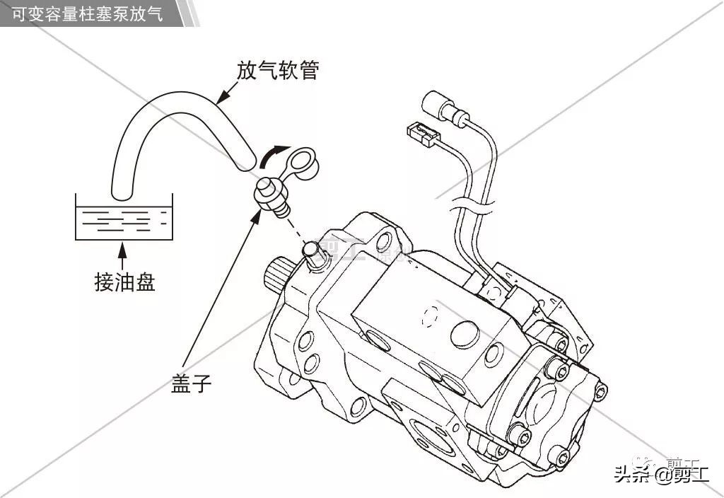 可变容量柱塞泵的放气步骤 (1) 我们来看看可变容量柱塞泵的放气过程,第一步要向油箱内加注规定油量的液压油,当然整个更换过程中要注意避开扬尘较大的环境,以及机器必须停放在平坦地面上。 (2) 第二步拆卸下液压油箱盖。 (3) 第三步将放气软管妥善安装在放气阀处,然后拧松放气阀 1/2 圈。(软管内径 : 5 mm)