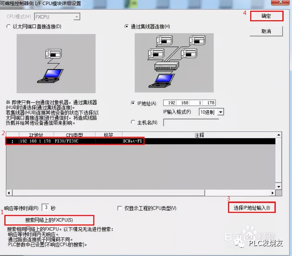 2)在随后的跳出的设置中,点击“搜索网络上的FXCPU(S)”后,会搜索到BCNet-FX所连接的FX3UC。按图中标号依次选择后,最后点击确认;