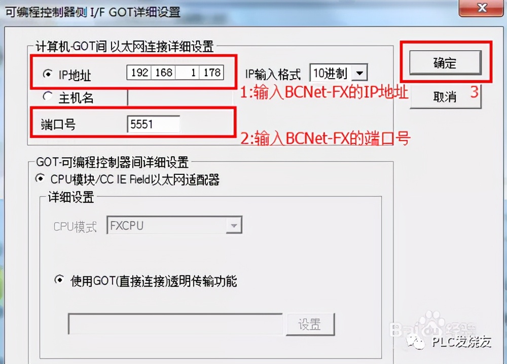 2)在随后的跳出的设置中,在IP地址中输入BCNet-FX的IP地址,在端口号中输入BCNet-FX的端口号。按图中标号依次选择后,最后点击“确认”;
