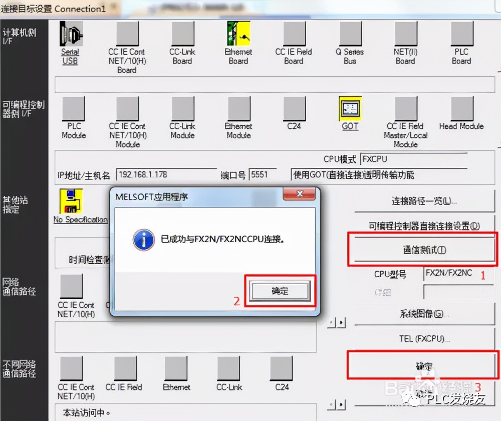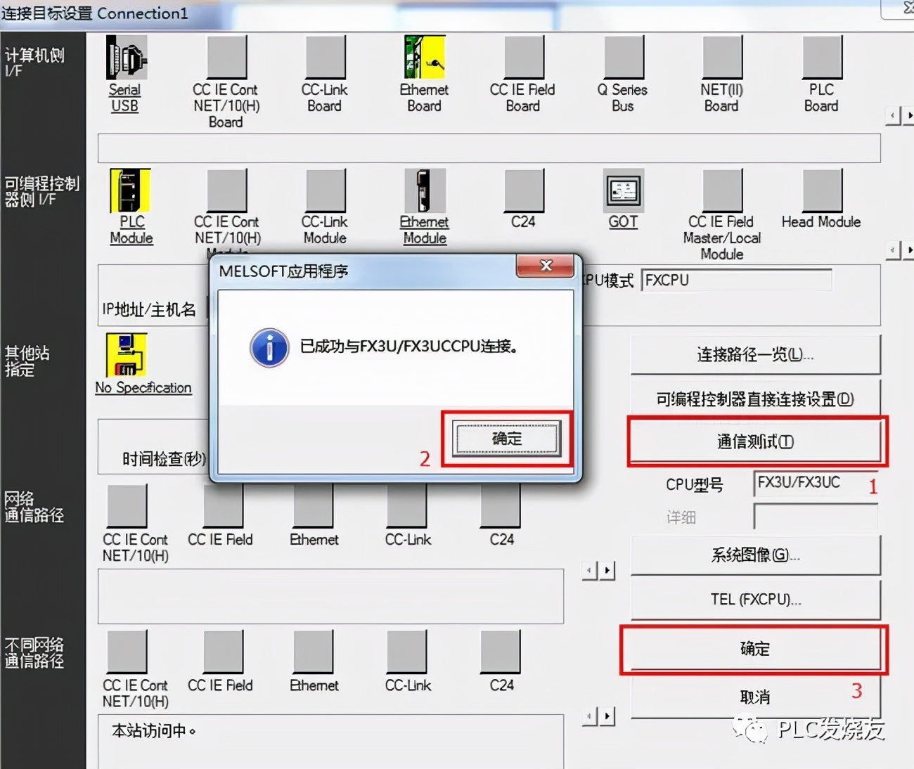 3)在上述中选择好IP地址后,点击“通信测试”,即可提示与FX3UCCPU连接成功。