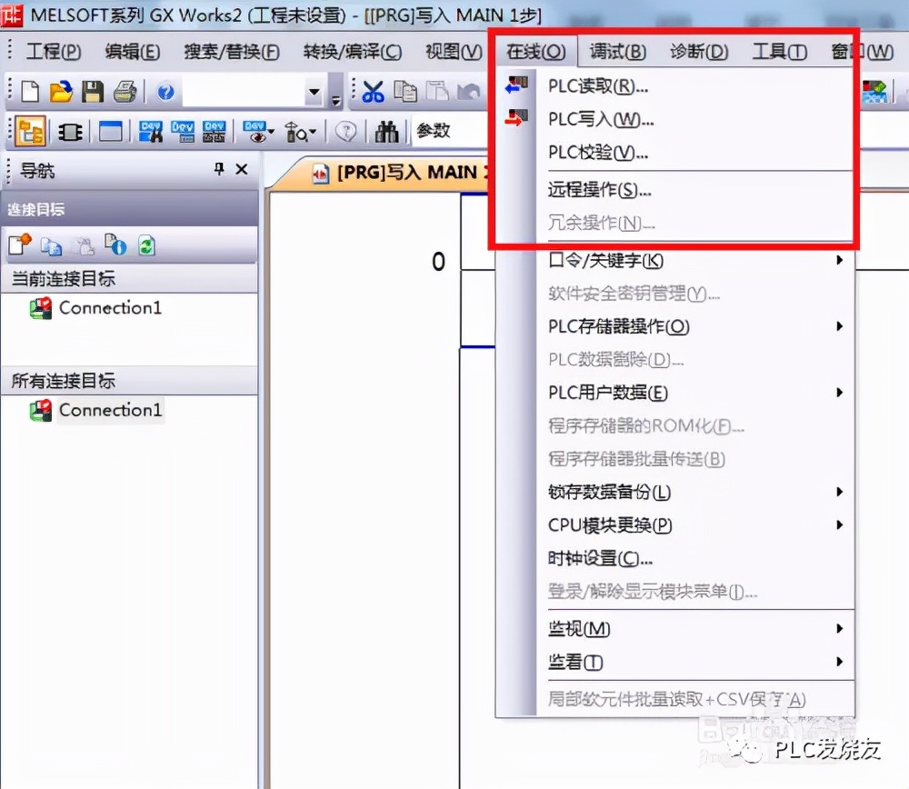 4)随后即可“在线”选项栏中,进行PLC的读取、写入和监视等操作。