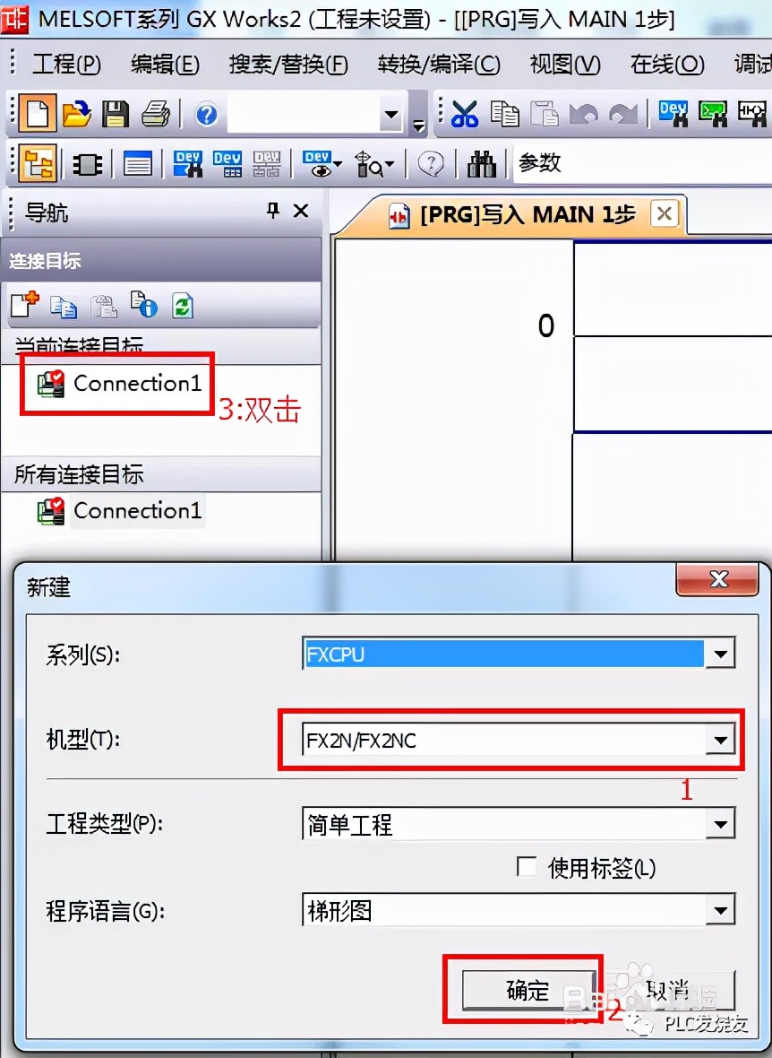 新建FX2N/FX2NC工程,双击导航栏中的连接目标:Connection。