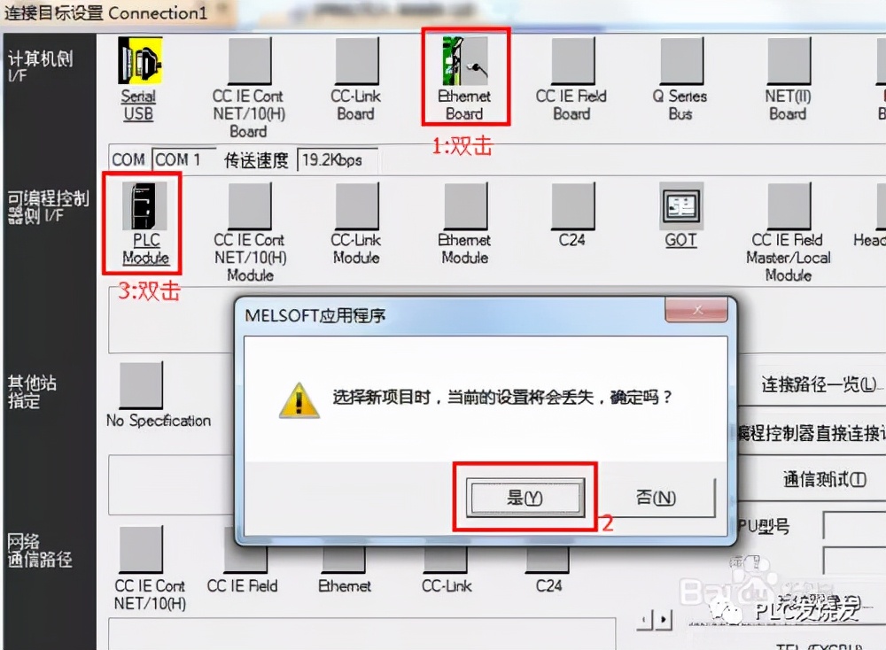 1)跳出的选项板后,在计算机侧选择双击“EthernetBoard”选项,随后提醒中点击“是”;在可编程控制器侧双击“PLC Module”;