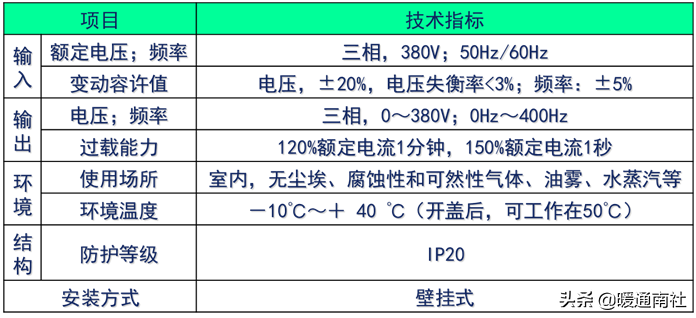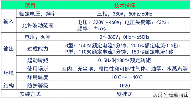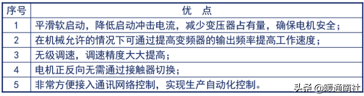 变频器:变频器是交流电气传动系统的一种,是将交流工频电源转换成电压、频率均可变的适合交流电机调速的电力电子变换装置,英文简称VVVF ( Variable Voltage Variable Frequency) 变频器的控制对象:三相交流异步电机和三相交流同步电机,标准适配电机极数是2/4极。 变频调速的优势(与其它交流电机调速方式对比):