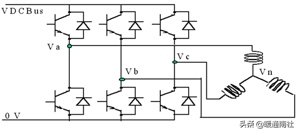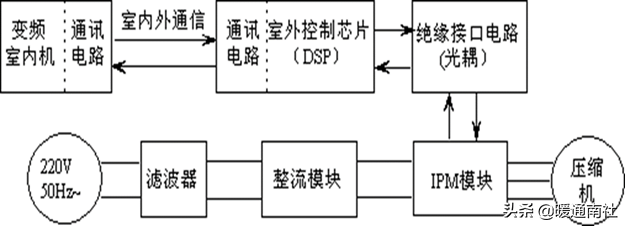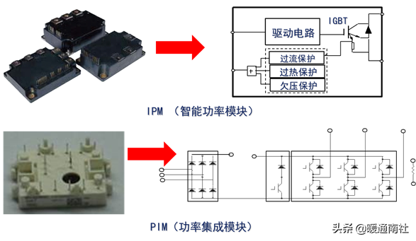根据转子结构形式的不同,直流变频的电机可以分为IPM与SPM两种。 SPM表面型磁极(Surface Permanent Magnetic):将永久磁铁配置于转子表面; IPM表面型磁极(Interior Permanent Magnetic):将永久磁铁嵌入于转子内部; 从电机效率上看,压缩机采用IPM型比SPM型要高; 变频空调主要元器件: 变频模块:变频模块是实现由直流电转变为交流电从而驱动压缩机运转的关键器件,又称为IPM(Intelligent Power Module)模块。它是一种智能的功率模块,它将6个IGBT管连同其驱动电路和多种保护电路封装在一起,从而简化了设计,提高了整个系统的可靠性。从其驱动电路使用的电源数目又可分为单电源与四电源两种。 变频模块(IPM)内部简图: