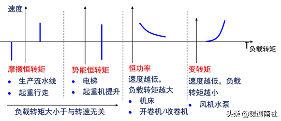 速度模式:以控制转速恒定为目的,控制设备根据设定速度要求自动调整电机转矩适;应外部的负载变化,达速时电机转矩等于负载转矩; 应用:如常规调速系统(电梯、各类生产线)。 转矩模式:以控制电机转矩恒定为目的,达速时电机转矩等于负载转矩,但电机的运转速度不确定,如果控制不当可能会引起传动设备超速损坏等事故,为保证系统安全,必须额外考虑限速或超速保护。 应用:如:开卷/收卷。 电气传动系统负载特性: