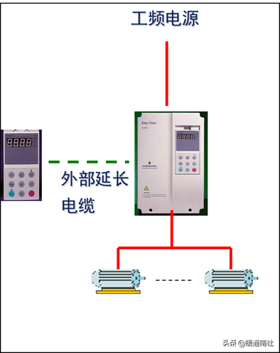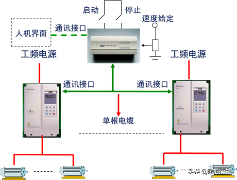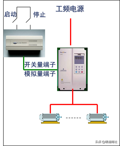 特点:运行命令由外部启停按钮决定,通过变频器外部端子FWD/REV决定运行方向; 运行给定一般由外部模拟端子决定: PLC 模拟输出;电位器;与外部逻辑电路或PLC共同控制变频器。 适用场合: 应用在实时性较强独立系统;使用范围最广。 外部端子控制(多机):