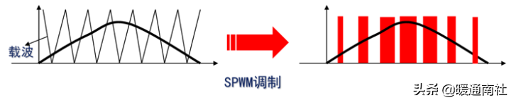 PWM示意图 直流变频空调器原理: 从整机形式上看,直流变频可分为全直流变频与部分直流变频。 全直流变频是指压缩机、室内外风机均使用直流无刷电机,部分直流指只有压缩机使用直流无刷电机。 直流变频名称的由来: 家用电器上,直流变频最常用(也是一直以来都在使用)的是无刷直流电机,为了把这种变频与交流变频进行区别,人们习惯上把使用了无刷直流电机的变频家电称为直流变频家电。 和电子膨胀阀、无氟空调一样,直流变频是一个约定俗成的词语,这种命名方法有一定的误导性。 所以,直流变频并不是说压缩机是直流电供电,它的转化方式上与交流变频一样,都是采用交-直-交的方式。供给压缩机的电压还是交流的信号。这种电机实际也是一种交流电动机。 直流变频电动机的基本结构: 用装有永磁体的转子取代有刷直流电动机的定子磁极,用具有多相绕组的定子取代电枢,用位置传感器及控制器组成的电子换向器取代传统的机械换向器和电刷。这样,就得到了无刷直流电动机。 由于无刷直流电动机与传统的直流电机。 无论是结构还是调速性能都有很多。 相似之处,所以人们习惯把这种;电机称为无刷直流电机。