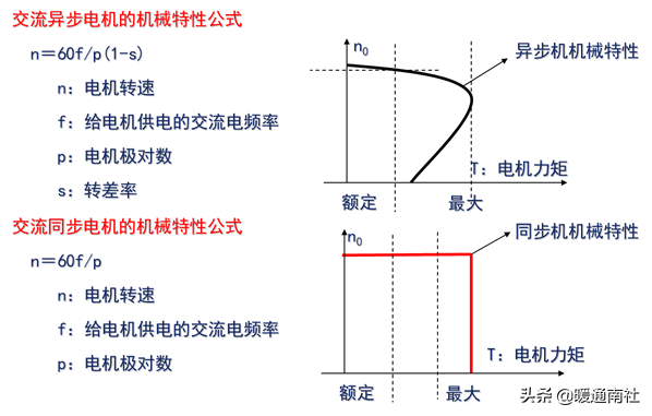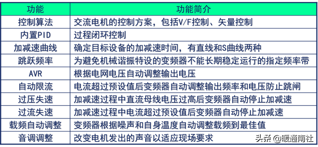 交流调速的控制核心:在预定的频率(速度范围内)保持电机磁通恒定才能保证电机出力,才能获得理想的调速效果。 V/F控制-简单实用,性能一般,使用最为广泛只要保证输出电压和输出频率恒定就能近似保持磁通保持恒定。 例:对于380V 50Hz电机,当运行频率为40HZ时,要保持V/F恒定,则40HZ时电机的供电电压:380×(40/50)=304V低频时,定子阻抗压降会导致磁通下降,需将输出电压适当提高。 矢量控制-性能优良,可以与直流调速媲美,技术成熟较晚。 模仿直流电机的控制方法,采用矢量坐标变换来实现对异步电机定子励磁电流分量和转矩电流分量的解耦控制,保持电机磁通的恒定,进而达到良好的转矩控制性能,实现高性能控制。性能优良,控制相同复杂,直到90代计算机技术迅速发展才真正大范围使用。 核心控制算法: