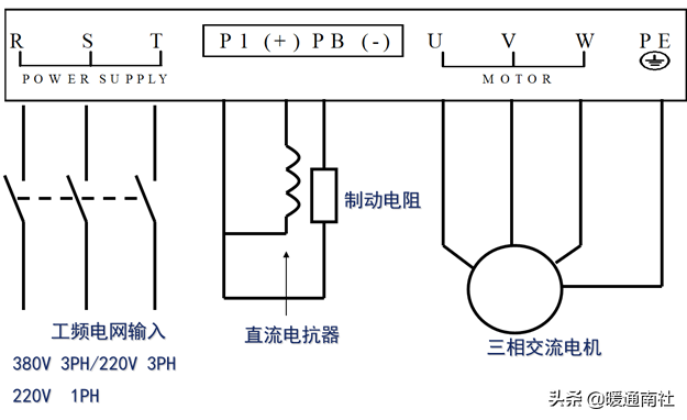 变频器关键技术指标: 输入侧: 额定工作电压:给变频器供电的额定工作电压; 电压允许波动:限制变频器的最高和最低工作电压,避免损坏变频器; 频率波动范围:50/60Hz±5%。 输出侧: 额定输出电压:变频器的最大输出电压,由额定工作电压决定; 额定电流:变频器能够长期输出的最大电流; 过载能力:变频器的输出电流允许超过额定电流的倍数和时间,由逆变模块决定; 最大输出频率:变频器能够输出的最大工作频率; 频率精度:输出频率的准确度(相对于设定频率); 频率分辩率:指给定运行频率的最小改变量; 防护等级:一般是IP20 (“0”代表不防水)。 实用原理框图: