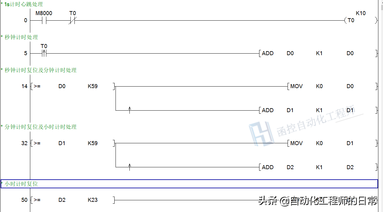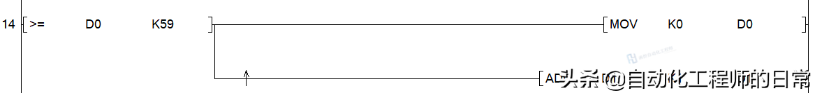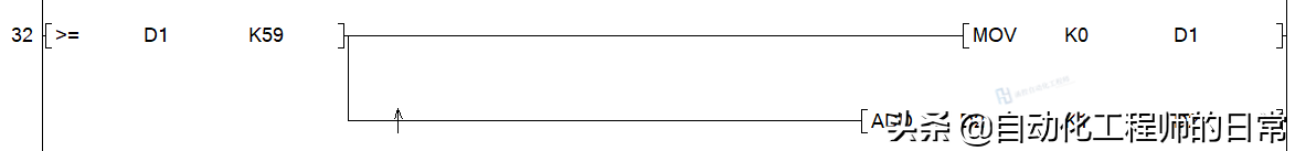 取1s定时器的触点导通的上升沿信号,对秒钟加一计时。每计时一秒,则D0加1.  秒钟复位及分钟计时处理