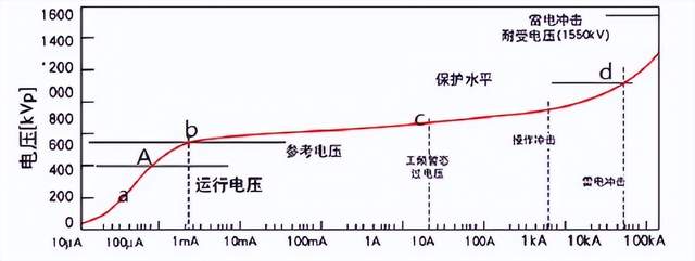正常使用的工作状态是在A点以下低电场,氧化锌晶粒中的自由电子由于电场低,等不到足够的势能越过晶介层界面薄膜的势叠,自由电子主要以热电子的形式活动,其伏安特性对温度的依赖性很大。