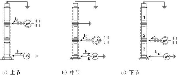两节及以上串联结构避雷器可采用不拆高压引线试验,典型接线图(图2图3)中直流高压输出端串接微安表(读数记为IX),低压端直接接微安表或串接限流电阻后接微安表(读数记为I1)接地。