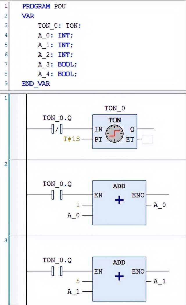 Web服务器的监控功能 你可以通过Web服务器可以随时随地访问 M241,获取设备的实时数据、进行配置和管理管理。接下来我将用一个简单案例演示Web服务器的监控功能 1 确认好M241 PLC中的IP地址以及Web服务器协议被激活。 2 新建简单POU,如图4所示。案例功能:每隔1S,A_0加1,A_1加5。