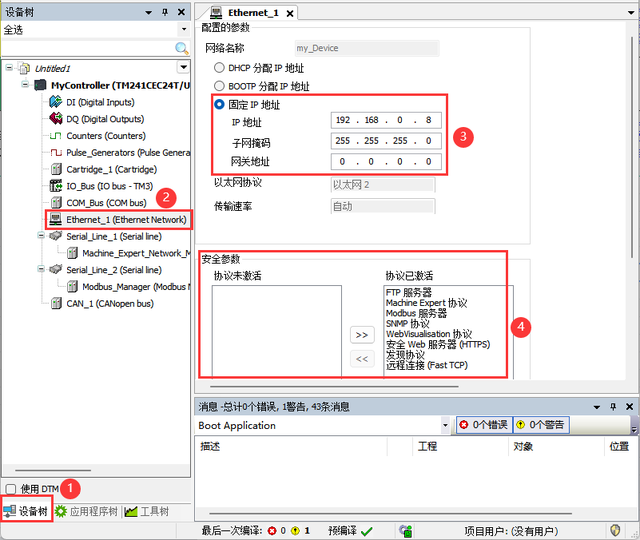 M241 PLC如何进入Web服务器 1 确认好M241 PLC中的IP地址以及Web服务器协议被激活。如果不确定,可以机器专家软件中,点击【设备树】—【Ethernet_1】,填写IP地址、子网掩码、激活协议。如图1所示。