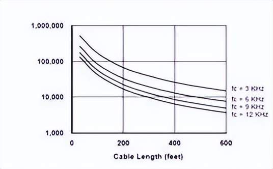 变频器的载波频率越高,输出电流波形越接近正弦波,这会降低电机的运行温度,从而延长绝缘的寿命。但是,更高的载波频率意味着每秒钟产生的尖峰电压数量更多,对电机的冲击的次数更多。图4给出了绝缘寿命随着电缆长度与载波频率的变化。从图中可知,对于200英尺长的电缆,当载波频率从3kHz提高到12kHz(变化4倍)时,绝缘的寿命从大约8万小时降低到2万小时(相差4倍)。