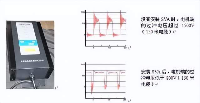 4)在电缆与电机接口的位置安装尖峰电压吸收器:前面几个措施的缺点是当电机的功率较大时,电抗器或滤波器的体积、重量很大,价格较高,另外,电抗器和滤波器都会导致一定的电压降,影响电机的输出力矩,采用变频器尖峰电压吸收器能够克服这些缺点。航天科工集团二院706所开发的SVA尖峰电压吸收器,采用先进的电力电子技术和智能控制技术,是解决电机损伤的理想设备。另外,SVA尖峰吸收器还能保护电机的轴承。