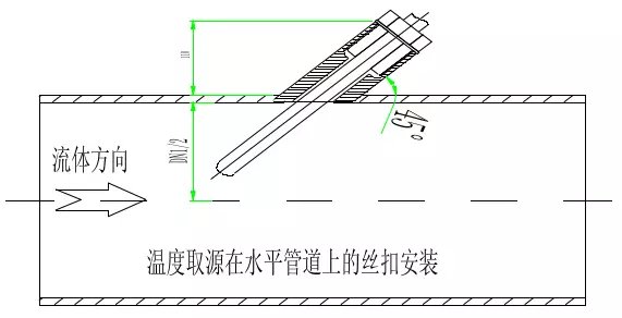 4. 在多粉尘的工艺管道上安装的测温元件,应采取防止磨损的保护措施。 5. 热电偶或热电阻安装在易受被测介质强烈冲击的地方,以及当水平安装时其插入深度大于1米或被测温度大于700℃时,应采取防弯曲措施。 6. 表面温度计的感温面应与被测表面紧密接触,固定牢固。 7.在肘管上安装温度计,安装时必须使温度计轴线与肘管直管段的中心线重合。 8.用热电偶测量炉温时,应避免测温组件与火焰直接接触,也不宜距离太近或装在炉门旁边。接线盒不应碰到炉壁,以免热电偶冷端温度过高。 9.使用热电偶、热电阻测温时,应防止干扰信号的引入,同时应使接线盒的出现孔向下方,以防止水汽、灰尘等进入而影响测量。 10.若工艺管道过小,安装测温组件处可接装扩大管。 热电偶、热电阻、双金属温度计在DN<80mm的管道上安装。 11.热电偶安装时应放置在尽可能靠近所要测的温度控制点。为防止热量沿热电偶传走或防止保护管影响被测温度,热电偶应浸入所测流体之中,深度至少为直径的10倍。当测量固体温度时,热电偶应当顶着该材料或与该材料紧密接触。为了使导热误差减至最小,应减小接点附近的温度梯度。