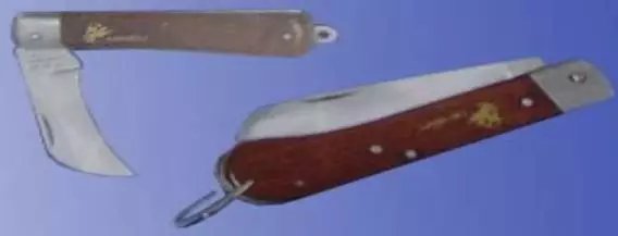 电工刀如图所示。适用于在装配维修工作中割削导线绝缘外皮,以及割削木桩和割断绳索等。电工刀按刀片尺寸的大小又可分为大号(112mm) 和小号(88mm)两种。 使用注意事项:
