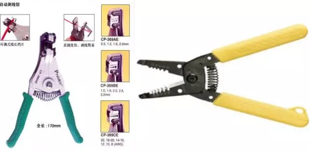 剥线钳是用来剥削小直径导线绝缘层的专用工具,其外形如图所示。它的手柄是绝缘的,耐压为500V。常用的有手动和自动两种。 自动:根据导线内部金属丝尺寸自适应,从而不伤内部导线;而且剥线长度可调节。