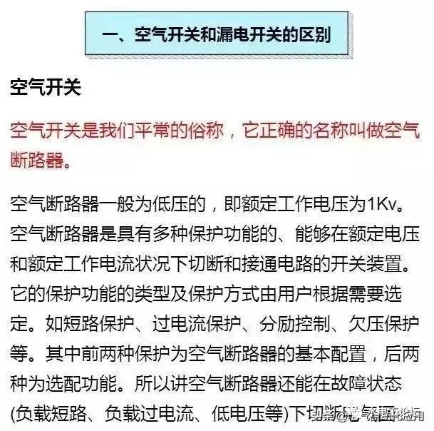 在保护作用方面,空气开关只是相对于大电路的电流起着保护作用,主要检测线路中的的短路以及承载过重的电流,漏电开关则是相对于小电路产省保护作用,主要检测线路设备、保护人体安全以及设备的安全;在跳闸方面,空气开关则是通过火线和零线,两线间电流太大的话就会导致跳闸,而漏电开关只是因为火线,人体接触火线就会和地面形成一个回路,从而导致里面的装置就会自动感触,达到跳闸的目的,起着保护的作用。