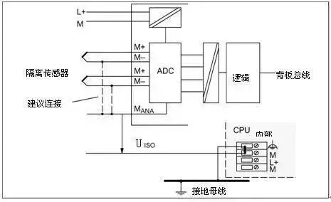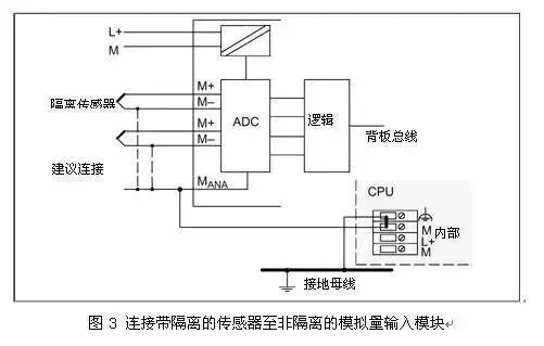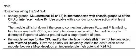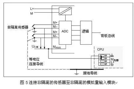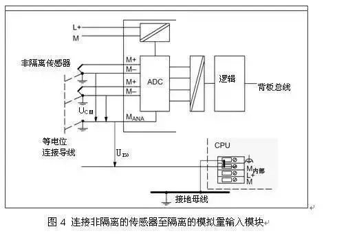 这回我来讲讲使用非隔离的模拟量模块连接隔离的传感器的情况,模块的MANA与地M不隔离,这样必须连接MANA与地M,模拟量的参考点电位变成地M,典型接线如图3所示: 非隔离的模块都要求连接连接MANA与地M,例如模块SM334(6ES7334-0CE01-0AA0),在提示中强调必须连接,下面为引用手册的提示部分。 5、使用隔离的模拟量模块连接非隔离的传感器传感器不隔离,那么信号源端以传感器本地的地为基准点电位。模块是隔离的,以MANA点为测量基准电位。典型接线如图4所示, 从图4可以看到,非隔离的传感器信号负端在源端接地,但是如果连接多个非隔离的传感器并且分布在不同的地方(不同的接地点),这种情况下就比较麻烦。各个传感器信号的负端会有共模电压UCM ,为了消除UCM ,将各个信号的负端在源端使用短而粗的导线进行等电位连接,由于模块的MANA和信号源端的地可能存在电位差,还要将MANA与源端的地进行等电位连接。在这里不能在模块处进行短接,否则不能消除UCM。 如果工厂接地不好,最好还是使用隔离的传感器。 6、使用非隔离的模拟量模块连接非隔离的传感器