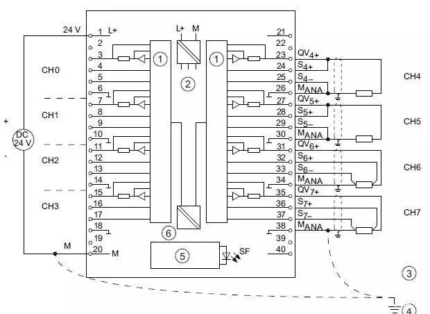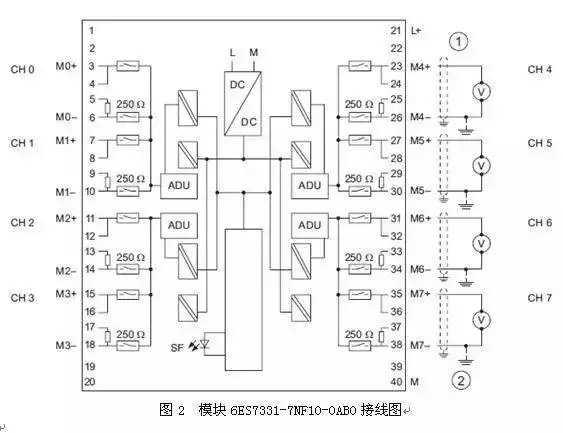 隔离传感器与隔离模拟量信号连接图如图1所示: 图1 连接隔离的传感器至隔离的模拟量输入模块 这种方式最简单,都与地隔离,都不需要接地,但是输入信号(传感器)负端与MANA 电压超过UCM最大限制,例如SM331(6ES7331-7KF02-0AB0)为2.5 VDC,就需要短接信号负端与MANA ,否则会出现超上限问题。现场可以查看一下,几乎所有超上限问题都是没有连接信号负端与MANA 。如果UISO 超过限制,例如75V DC,就需要连接信号负端、MANA 端以及接地端M,这时模块以大地M端为参考电位,实际变为非隔离使用了,这种情况很少见。 有的模块通道组间都是隔离的,没有MANA ,例如模块6ES7331-7NF10-0AB0,接线如图2所示: 这时每一个通道组(每组2通道)的M-就是MANA ,输入通道组间UCM 最大为以达到75VDC。 都隔离的情况下连接信号负端与MANA 端就可以了(2线制和电阻测量除外)。手册每个模块接线图中MANA都是建议接地的,我认为这是在接地良好、不会产生共模电压(例如单端接地)的情况下. 4、使用非隔离的模拟量模块连接隔离的传感器