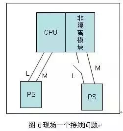 如果使用非隔离的模拟量连接非隔离的传感器,那么一定将所有的点接地并进行等电位处理。典型接线如图5所示, 从图5可以看到,按照隔离与非隔离的要求,模块不隔离,必须连接MANA与地M,传感器不隔离则需要连接信号负端到本地的地,这样一边以信号源的地作为基准点,一边以模块的地M作为基准点,为了消除两者之间的电位差(共模电压UCM),需要使用足够粗的导线进行等电位连接。 如果整个工厂有等电位的接地网,使用非隔离的仪表和模块就比较简单,只需要连接MANA到本地的地M即可,因为每个点都等电位。往往事与愿违,由于非隔离的仪表价格便宜,越是使用这样仪表的地方,地通常打得都不会好,就更别提接地网和等电位连接了。不采取措施肯定有问题,必须保证等电位。使用万用表可以测量,那是因为万用表与地是隔离的,最大的共模电压UCM 也可能不同 ,与模块不在相同的条件下。建议使用隔离的传感器和模块。 讲了一系列的接线方式,最终的结论就是模拟量接线的几种方式都集中在一点上,就是信号源端与测量端一定要等电位。 讲到这里要再扩展一下,利用这个原则同样也可以解决数字量接线问题。下面是在现场遇见的一个问题,如图6所示,CPU与I/O的供电分开,I/O是一个非隔离模块,当现场给出信号,但是I/O模块的输入灯没有点亮,在CPU中也不能读出,使用万用表测量,在端子上有24V电压。模块没有问题,将两个电源PS的M端短接,就可以检测到输入信号,这也是由于参考点电位不同造成的。希望一点小小的提示可以帮助大家解决现场模拟量接线的问题。 |