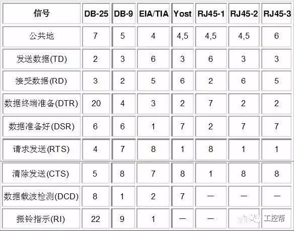 根据设备供电电源的不同,+-5、+-10、+-12和+-15这样的电平都是可能的。 2、连接器的机械特性 由于RS-232C并未定义连接器的物理特性,因此,出现了DB-25、DB-15和DB-9各种类型的连接器,其引脚的定义也各不相同。最近,8管脚的RJ-45型连接器变得越来越普遍,尽管它的管脚分配相差很大。EIA/TIA 561标准规定了一种管脚分配的方法,但是由Dave Yost发明的被广泛使用在Unix计算机上的Yost串连设备配线标准 ("Yost Serial Device Wiring Standard")以及其他很多设备都没有采用上述任一种连线标准。下表中列出的是被较多使用的RS-232中的信号和管脚分配: