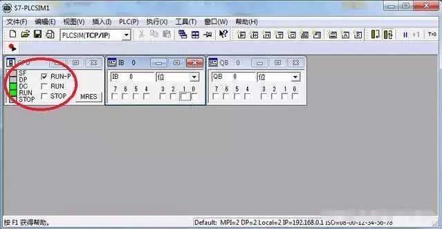 8)将PLC打到RUN模式,然后将测试的输入输出加到仿真里。