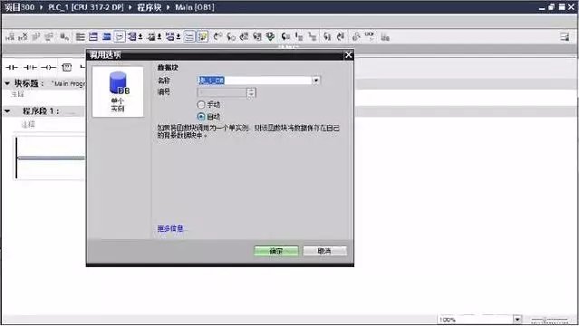 6)编写完程序后,回到OB1中调用FB1,系统会要求生成一个背景数据块,我采用默认数据块DB1,调用完程序后,我们填写FB1管角,仅需要填写第一个和第二个;第一个是中止功能块FB1命令,第二个是执行FB1功能块,也就是程序里第一步的执行条件。
