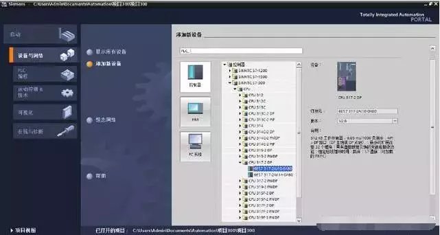 2)打开软件,建立新项目 3)添加一个新设备,这里选择cpu317-2dp,保存项目;