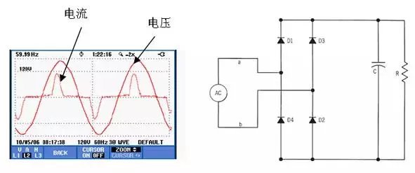 图1的右图所示的是一个典型的单相整流电路,这种电路从电网吸取的电流为脉冲状,如图1的左图所示。